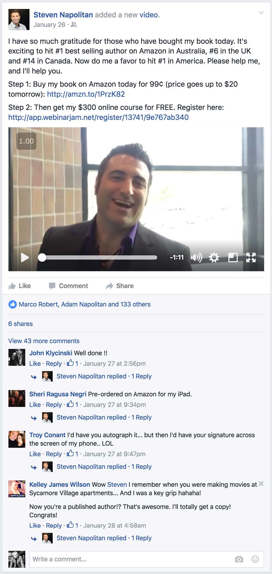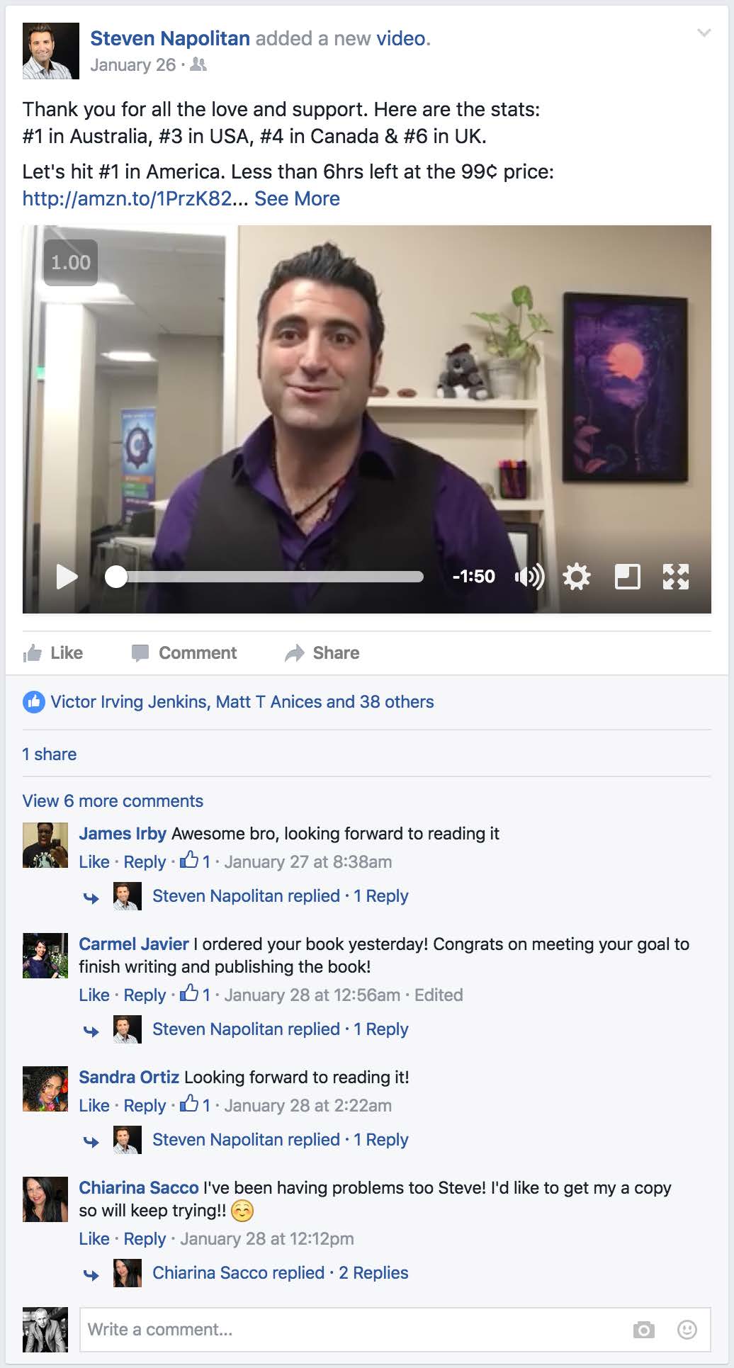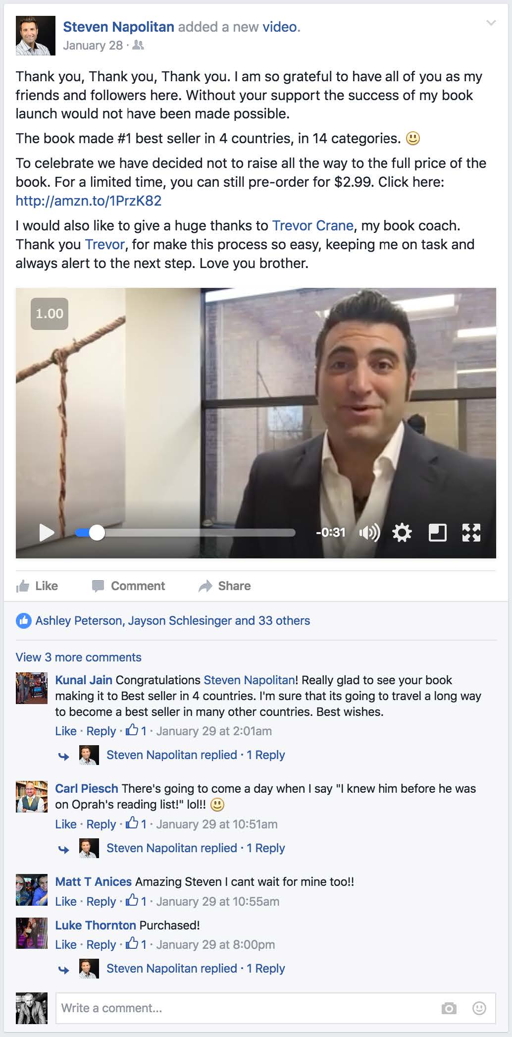 Steve posting “Celebration Videos” and thanking people during his launch. (A copy of these videos are in your BBB Bestseller Academy membership site, so you can model them.)